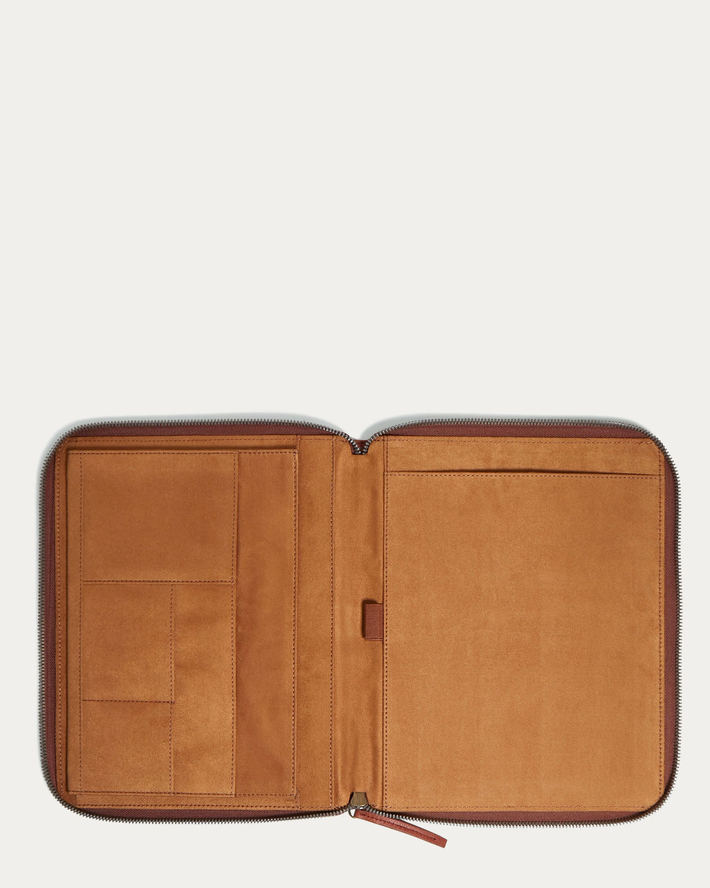 - Interior: left flap features a large gusset pocket with slip pocket and 2 small slip pockets; right flap features pen holder and large slip pocket